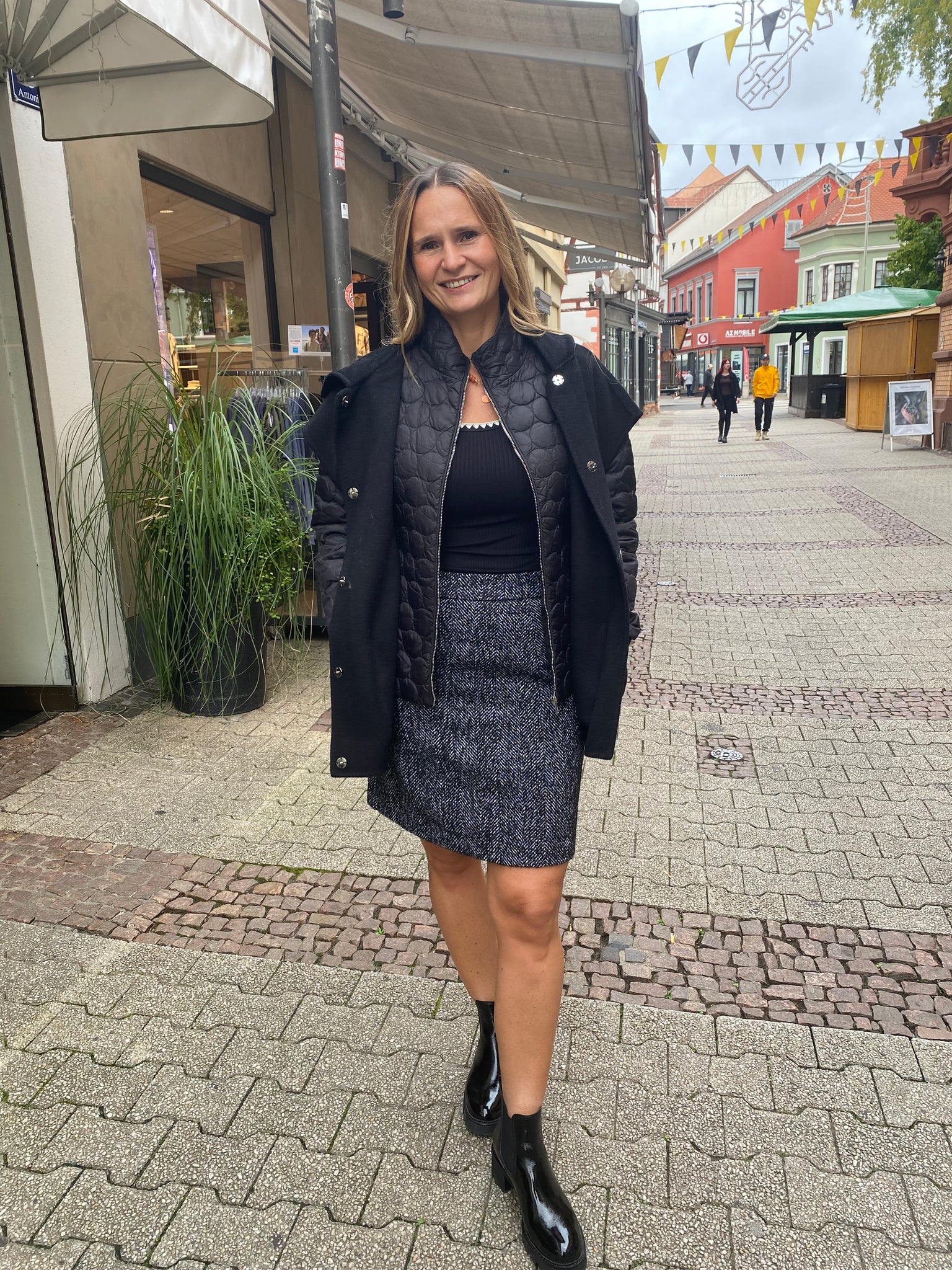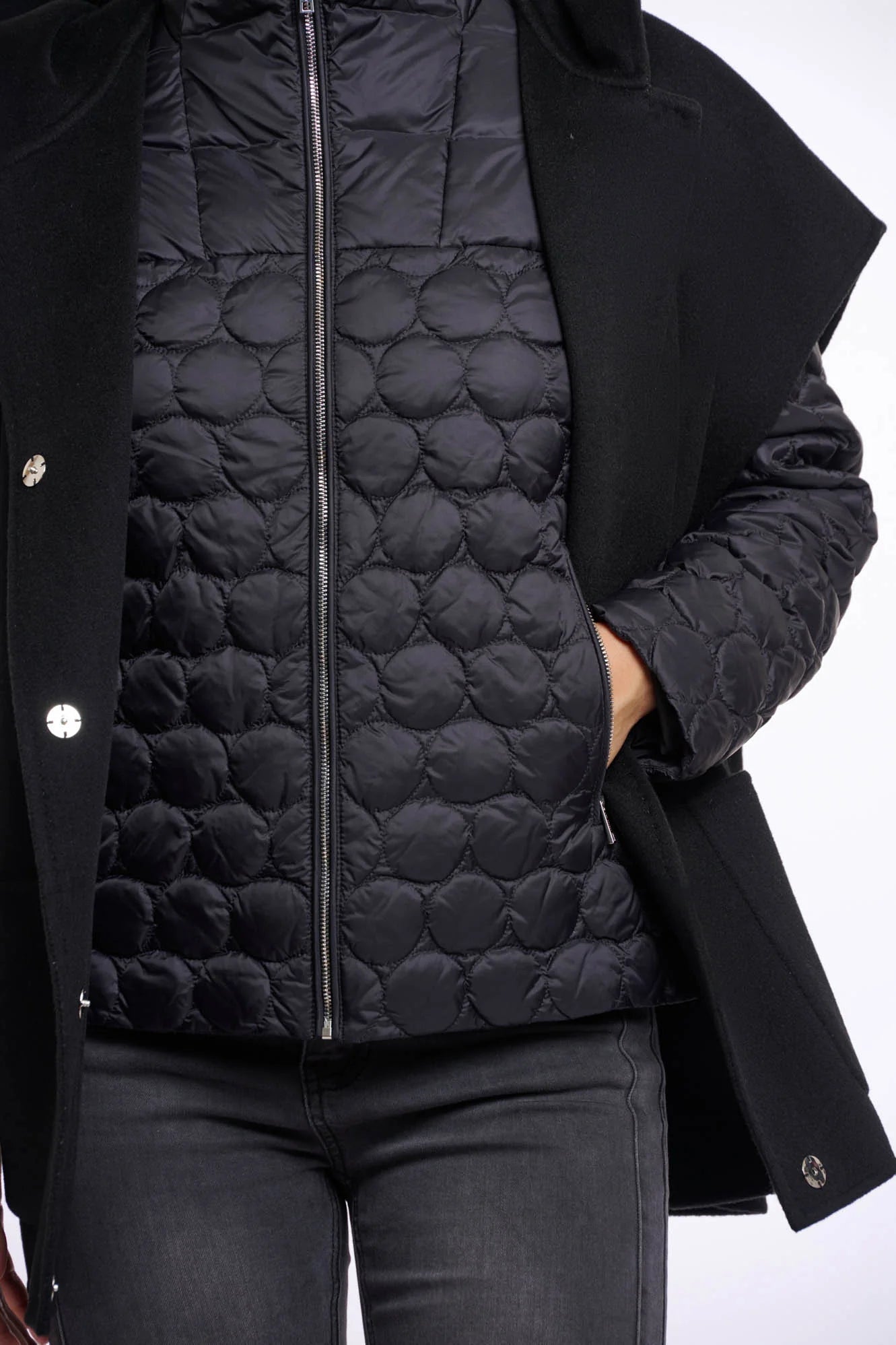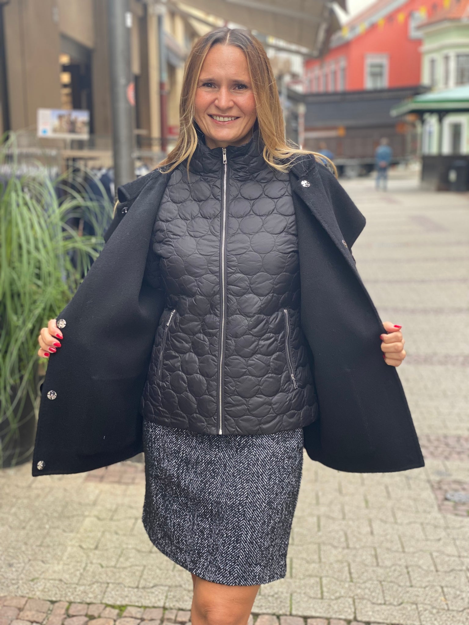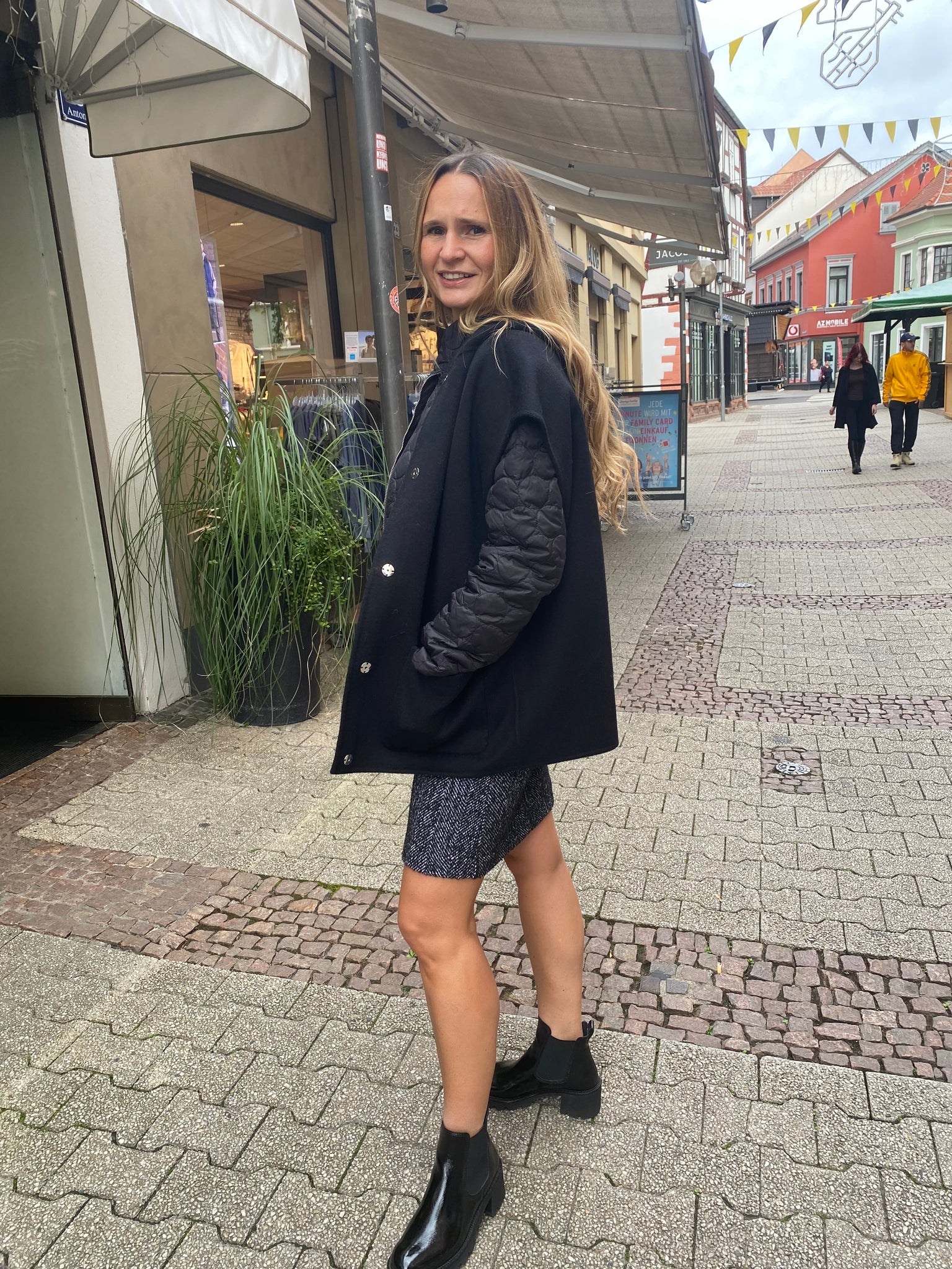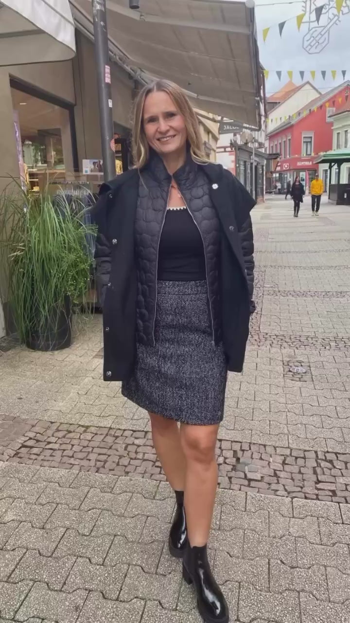 Die Jacke Helena ist ein wunderschönes, mehrlagiges Kleidungsstück, das Eleganz und Komfort miteinander verbindet. Das äußere Cape aus weicher Wolle schmiegt sich mühelos an den Körper und sorgt für einen zeitlosen, raffinierten look. Im Inneren sorgt eine leicht wattierte jacket für Wärme und einen subtilen Kontrast in der Textur, was sie perfekt für die Übergangszeit macht. Mit einer modernen Kapuze, großen Vordertaschen und einer entspannten Silhouette.
