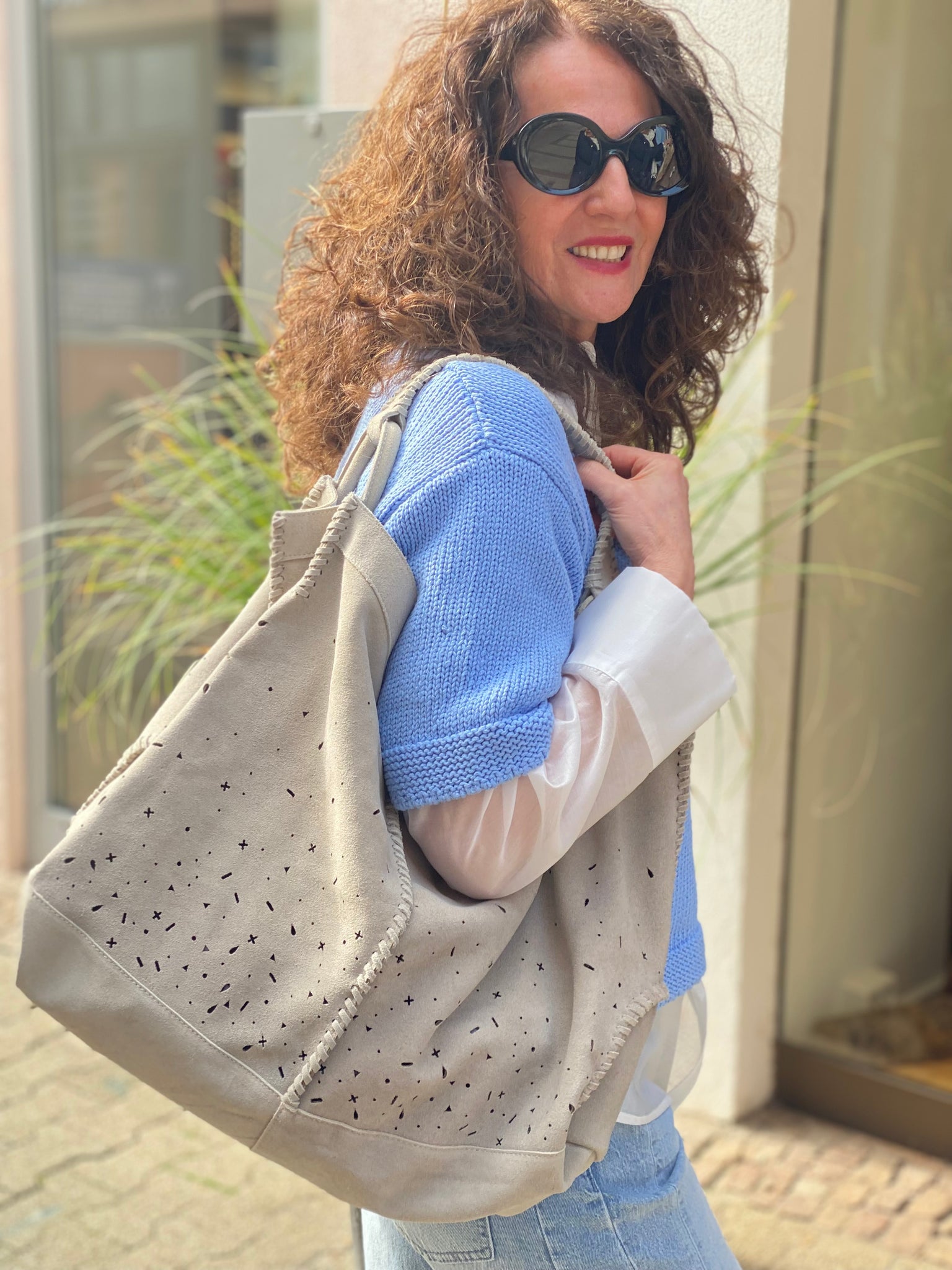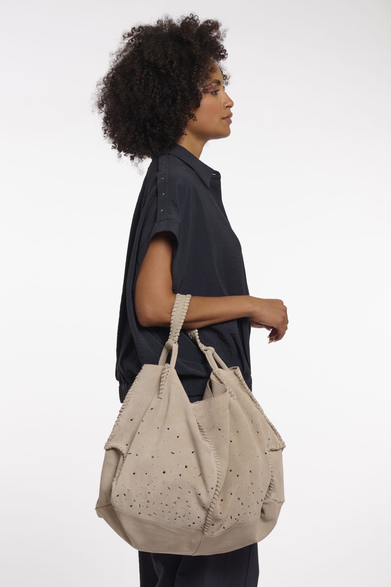Dank ihres großzügigen Formats bietet die Tasche viel Platz für Alltagsessentials – ideal für Shopping, Büro oder entspannte City-Looks. Die weiche Haptik des Wildleders und die robusten Henkel sorgen für angenehmen Tragekomfort, während die lässige Form eine mühelos elegante Wirkung erzielt.