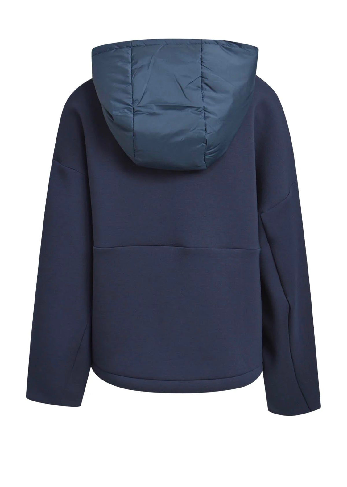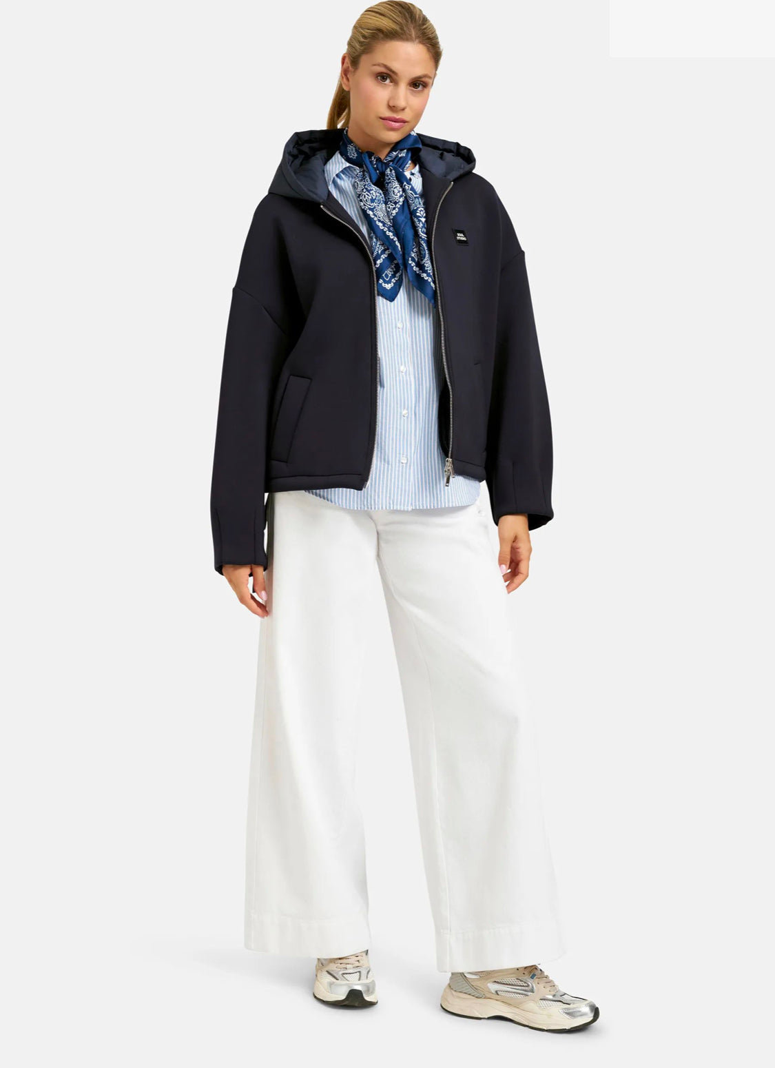 Die Jacke präsentiert sich als modernes, sportlich-cleanes Modell mit komfortablem Stretch-Anteil und locker geschnittener Silhouette. Dank der weich wirkenden, glatten Optik und dem entspannten Loose Fit wird sie zum unkomplizierten Begleiter im Alltag – ideal über Bluse oder Shirt. Die angesetzte Kapuze und der durchgehende Frontzip sorgen für eine lässige, zugleich praktische Note, während seitliche Eingrifftaschen und ein dezentes Logo-Badge auf der Brust das Design abrunden. Perfekt für entspannte Freizeitlooks, den Weg ins Büro im Casual-Stil oder für Wochenend-Aktivitäten, bei denen Komfort und Bewegungsfreiheit im Vordergrund stehen.